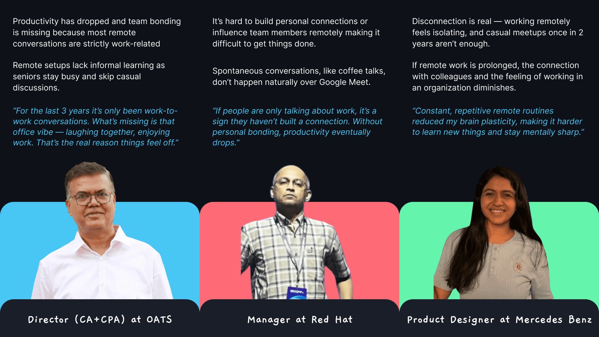 We noticed a shift at our homes, family members grew quiet working remotely. We saw how remote employees went to gyms and cafés to engage in casual conversation — the kind that once happened naturally in offices.